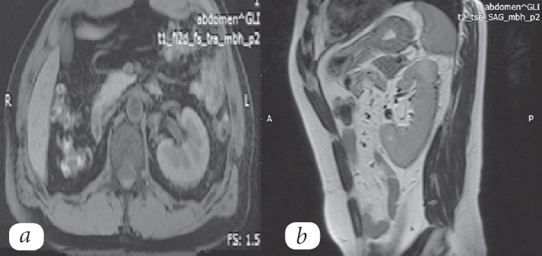 Рис. 6. МРТ с внутривенным контрастированием в аксиальной (а) и сагиттальной (b) плоскостях