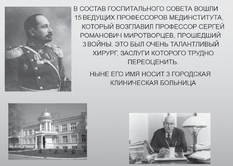 Fig. 1. S.R. Mirotvortsev during his years of service in the Military Medical Academy (top left); S.R. Mirotvortsev City Clinical Hospital No 3 of the city of Saratov (bottom left); Professor S.R. Mirotvortsev in the office (bottom right)