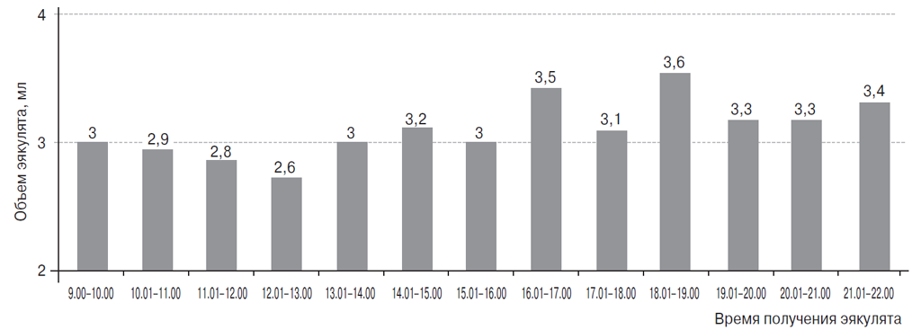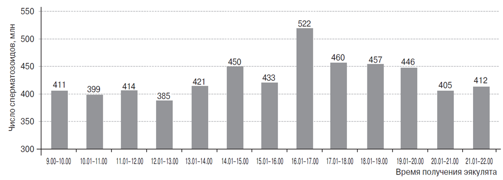 Результаты. Порции эякулята, полученные после 15:00, по сравнению со сданными в более раннее время дня в среднем имели большие объем (t = 5,63; p < 0,0001), количество сперматозоидов (t = 3,66; p = 0,0003) и количество прогрессивно подвижных сперматозоидов (t = 1,76; p = 0,078), а также меньшие концентрацию (t = 2,03; p = 0,043) и долю прогрессивно подвижных сперматозоидов (t = 4,63; p = 0,0003). Самые низкие средние значения количества сперматозоидов пришлись на интервал от 12:00 до 13:00, а самые высокие — от 16:00 до 17:00.
