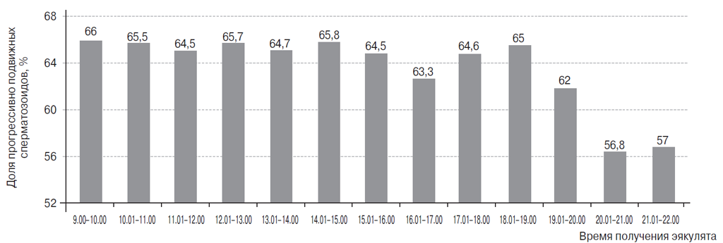 Доля прогрессивно подвижных сперматозоидов в эякуляте доноров была стабильно высокой (в среднем — 64,6 ± 10,0 %) в порциях, сданных в утреннее и дневное время, меньшие средние значения этого показателя наблюдали в образцах спермы, полученных после 15:00 (t = 4,63; p = 0,0003) и позже: в интервалах между 20:00 и 21:00, а также между 21:00 и 22:00 они составили 56,8 ± 9,5 и 57,0 ± 11,6 % соответственно (рис. 3).