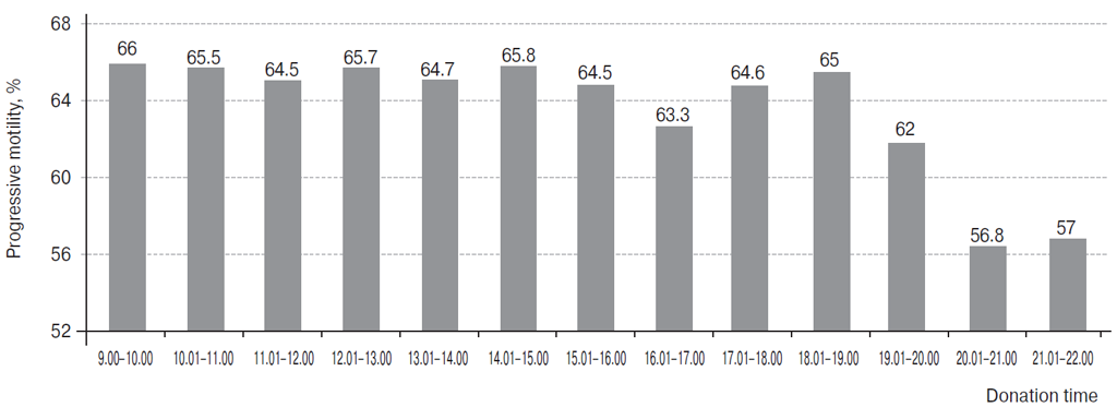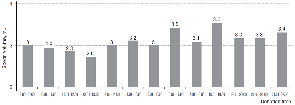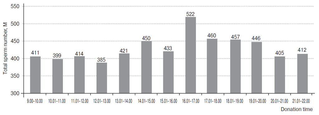 Materials and methods. Records of 1253 semen samples analysis of 39 sperm donors (mean age 27.1 ± 3.9 years) were retrospectively studied in reproductive medicine center in Saint Petersburg. Semen analysis was performed according to WHO 2010 recommendations. Diurnal variations of semen volume, sperm concentration, total sperm number, progressive motility and number of progressively motile sperm were analyzed.