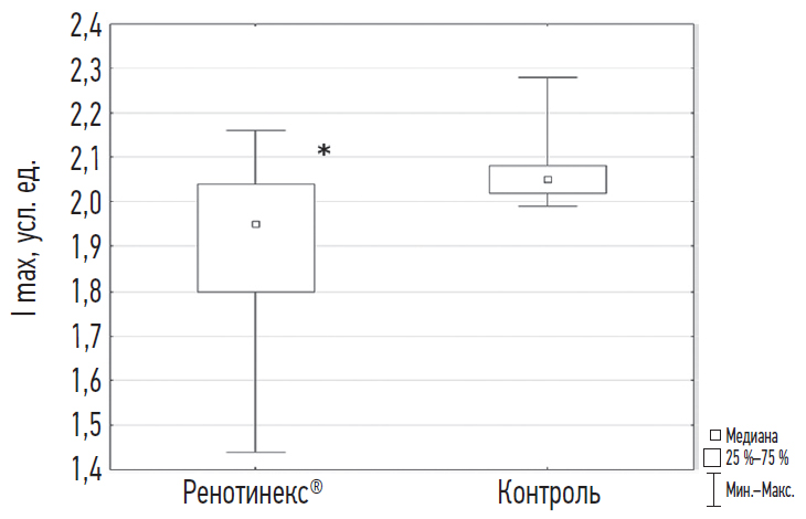 Что же касается процессов перекисного окисления липидов, то у больных после приема препарата Ренотинекс® по сравнению с контрольной группой наблюдалось снижение интенсификации данных процессов, выражающееся в уменьшении концентрации одного из главных вторичных продуктов ПОЛ — малонового диальдегида (рис. 3).