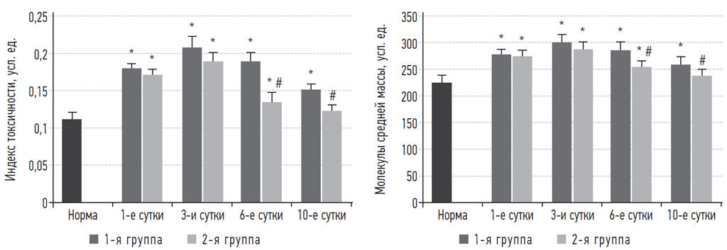 При изучении эндотоксикоза было установлено, что у пациентов 1-й группы значения ИТ и МСМ на 1, 3, 6 и 10-е сутки после операции превышали таковые в группе контроля на 18,5–20,6 и 21,2–24,5 % соответственно (p < 0,05). У пациентов основной группы уровни ИТ и МСМ были повышены только на 1, 3 и 6-е сутки на 17,6–13,8 и 18,7–14,9 % соответственно (p < 0,05), а к 10-м суткам эти показатели перестали статистически значимо отличаться от группы контроля (рис. 1).