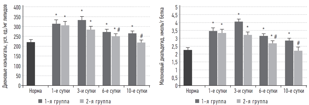 Рис. 2. Динамика показателей перекисного окисления липидов в крови у пациентов после открытой и лапароскопической нефрэктомии. Норма — группа контроля; *статистически значимое отличие от нормы; # статистически значимое отличие от 1-й группы / Fig. 2. Dynamics of lipid peroxidation products in blood in patients after open and laparoscopic nephrectomy. *Statistically significant difference from the norm; #statistically significant difference from the 1st group