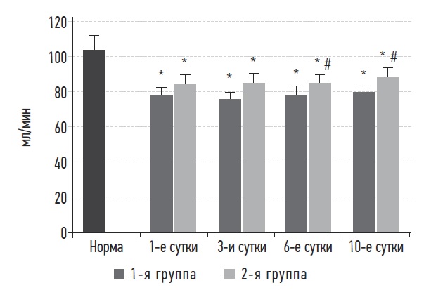 На 1, 3, 6 и 10-е послеоперационные сутки всем пациентам выполнены лабораторные исследования для комплексного анализа параметров гомеостаза (эндотоксикоза, окислительного стресса) и почечных функций. Эндотоксикоз оценивали в плазме крови по индексу токсичности (ИТ, условные единицы) и содержанию молекул средней массы при спектрофотометрическом анализе на длине волны 254 нм (МСМ, условные единицы). Активность перекисного окисления липидов (ПОЛ) оценивали по уровням в плазме крови диеновых конъюгатов (ДК, условные единицы / мг липидов) и малонового диальдегида (МДА, нмоль/грамм белка). Функциональное состояние почек оценивали по уровням в плазме крови креатинина (ммоль/л), остаточного азота (ммоль/л), мочевины (ммоль/л). Парциальные функции почек оценивали по пробе Реберга – Тареева — скорости клубочковой фильтрации (СКФ, мл/мин). Мочевой синдром оценивали по альбумин-креатининовому соотношению (АКС, мг/г) в моче.