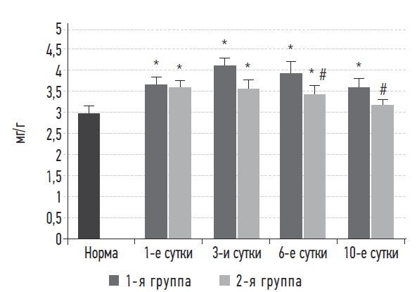 В послеоперационном периоде у пациентов с РП наблюдалась активация ПОЛ, то есть возрастание содержания первичных и вторичных метаболитов ПОЛ. При этом в группе сравнения увеличение показателей ДК и МДА относительно группы контроля составило соответственно: на 1-е сутки 17,2 и 21,3 %, на 3-и сутки — 20,1 и 24,6 %, на 6-е сутки — 19,2 и 22,5 %, на 10-е сутки — 15,6 и 17,1 % (p < 0,05).
