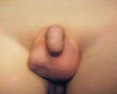 Fig. 1. Patient C., 30 years old. Testicle is pulled to the superficial inguinal ring. Photo was made before surgery