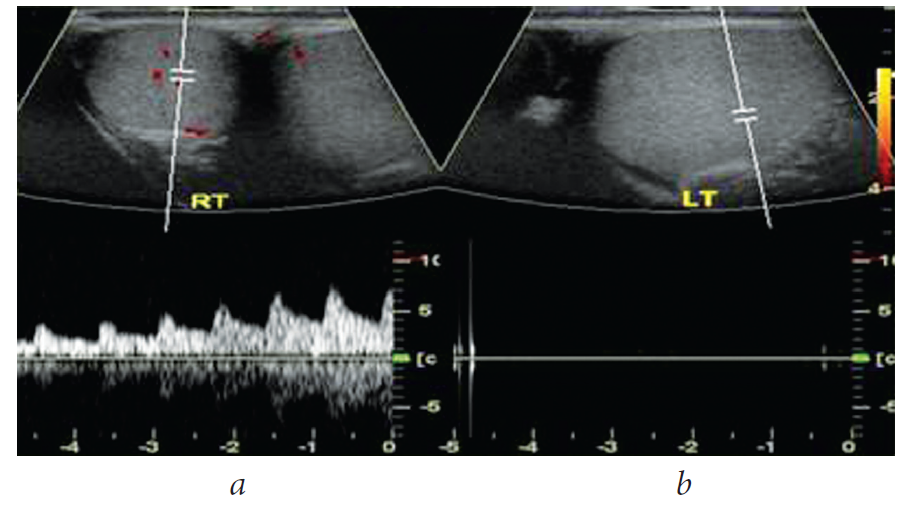 Fig. 2. Patient C., 30 years old. Scrotal Doppler ultrasound before surgery: a – normal blood flow in the right a.testicularis; b – absence of blood flow in the left a. testicularis, left testicle enlargement and torsion