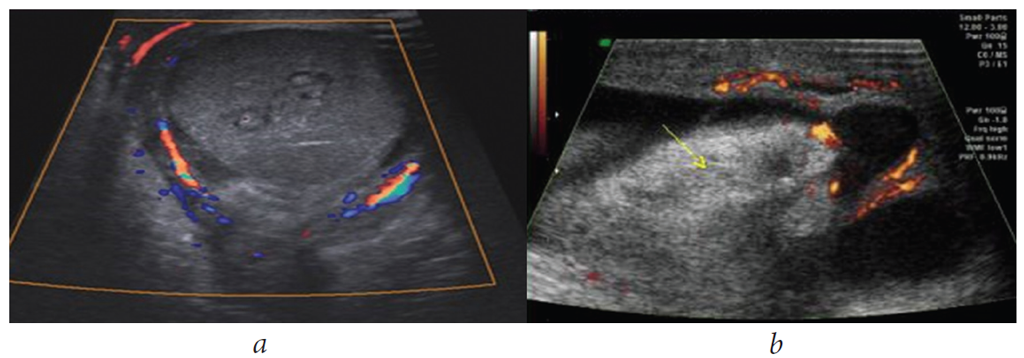 Fig. 3. Patient B., 27 years old. Scrotal Doppler ultrasound before surgery: a – significant blood flow decrease in testicular blood vessels, congestion of testicular tunics, lythic lesion of testicular parenchyma; b – absence of pulsation below torsion