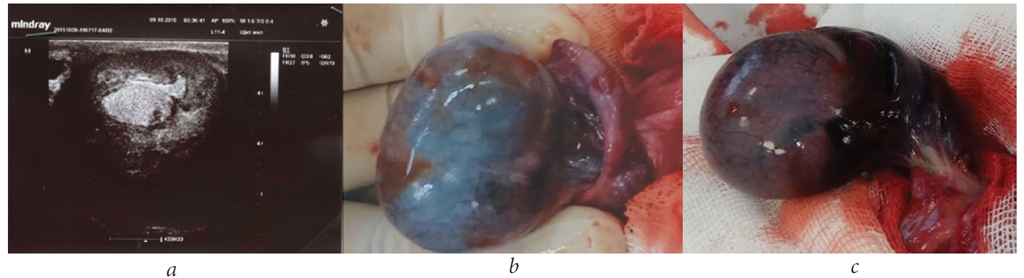 Fig. 4. Patient M., 30 years old, scrotal Doppler ultrasound, absence of pulsation below torsion (a); that testicle during surgery (testicular necrosis), torsion duration more than 24 hours, 360° torsion, orchiepididymectomy was performed (b, c)