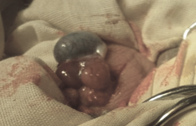 Fig. 5. Patient, 27 years old, testicle during surgery for 180° testicular torsion 6 hours after torsion happened, testicle is vital, orchipexia was performed