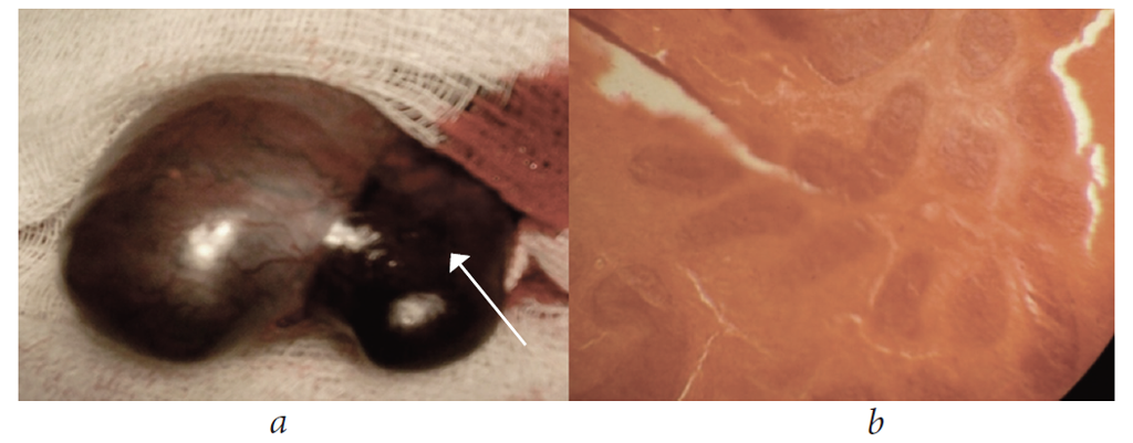 Fig. 6. Patient, 31 years old, gross specimen (necrotized testicle), 360° torsion, received non-surgical treatment for 2 days before hospitalization (a); hemorrhagic infarction was verified morphologically (b)