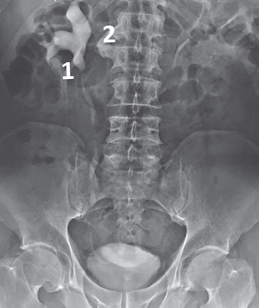 Fig. 1. Patient Z., age 68. Excretory urography: 1 – ureteral stricture; 2 – osteophyte