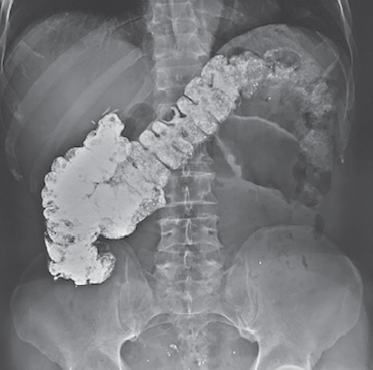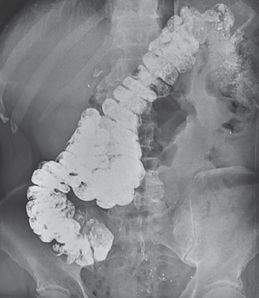 В связи с выраженными запорами и болями в правой половине живота пациенту произведена пероральная ирригография в положении лежа и стоя. На ирригограмме, выполненной через 24 ч после приема бариевой взвеси в положении лежа, установлена причина запоров и болей в правой половине живота — сращение восходящей и начального отдела поперечной ободочных кишки по типу «двустволки» протяженностью 10 см, приводящее к выраженному замедлению транзита кишечного содержимого (рис. 2).