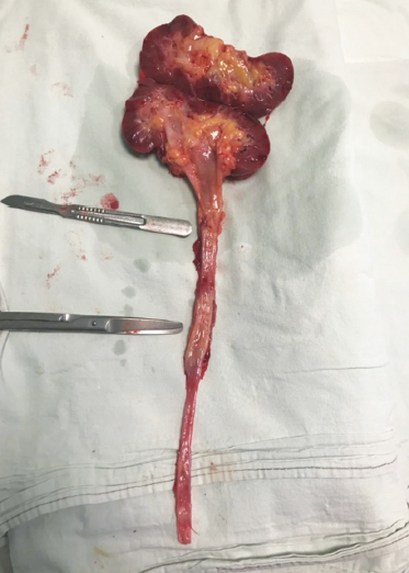 Сформулирован клинический диагноз: «Аденокарцинома правого мочеточника. Правосторонний гепатоколоптоз, осложненный спаечной двуствольной деформацией ободочной кишки, хроническим аппендицитом, запорами». 23.10.2018 произведена комбинированная (симультанная) операция: нефруретерэктомия справа, рассечение спаек брюшной полости, устранение двуствольной деформации ободочной кишки, аппендэктомия, правосторонняя колопексия, фиксация правого края печени. Первым этапом произведена нефруретерэктомия. Мочеточник в верхней трети утолщен до 8–9 мм в диаметре, пальпаторно очень плотный. Нижерасположенная часть мочеточника не изменена. На разрезе стенка мочеточника в верхней трети циркулярно утолщена, белесоватого цвета, без ворсин. Просвет мочеточника резко сужен (рис. 4). Увеличенных лимфоузлов в забрюшинном пространстве не обнаружено. Вскрыта брюшная полость. Выявлен выраженный спаечный процесс в правой ее половине. Большой сальник припаян к восходящей ободочной кишке на всем ее протяжении. Начальный отдел поперечной ободочной кишки спаян с восходящей кишкой на протяжении 10–12 см по типу «двустволки». Восходящая кишка имеет общую брыжейку с подвздошной кишкой. Выражена частая гаустрация восходящего отдела ободочной кишки, что указывает на его избыточную ортостатическую смещаемость. Червеобразный отросток расположен ретроцекально, утолщен до 8 мм, содержит несколько каловых камней. Печень чрезмерно подвижна правым краем, коронарная связка неровная (вероятно, результат травмы при падении с высоты). Произведено рассечение сращений, двуствольная деформация устранена, правый изгиб ободочной кишки фиксирован к задней париетальной брюшине в анатомически правильном положении, выполнены аппендэктомия и фиксация правого края печени путем реконструкции правой треугольной связки. Послеоперационный период протекал гладко, болевой синдром исчез, нормализовался стул. Гистологически подтверждена аденокарцинома мочеточника (Т2N0M0). В червеобразном отростке — хроническое воспаление.