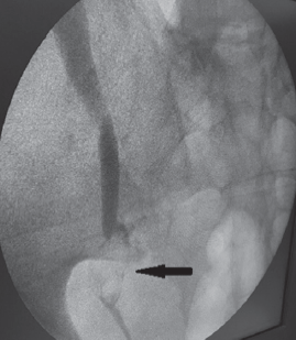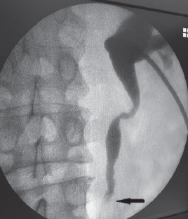 Рис. 5. Пациент К., 68 лет. Антеградная пиелоуретерография справа. Стрелкой отмечено расширение мочеточника в нижней трети, обтекаемого контрастом («симптом змеиного жала»)
