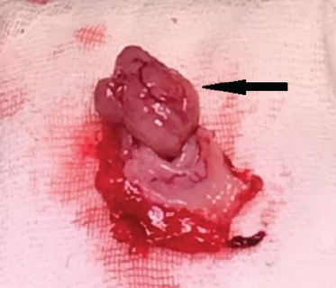 Рис. 7. Пациент К., 68 лет. Макропрепарат части удаленного правого мочеточника с опухолью. Стрелкой отмечена опухоль