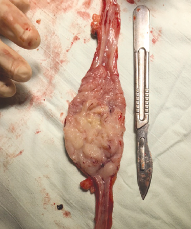 Рис. 8. Пациент К., 68 лет. Макропрепарат удаленного левого мочеточника с опухолью