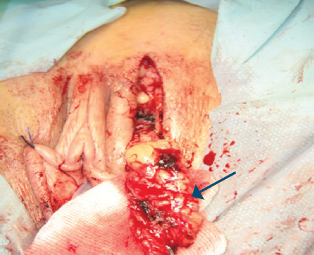 Fig. 1. Martius Graft (arrow) is obtained from the left labia majora