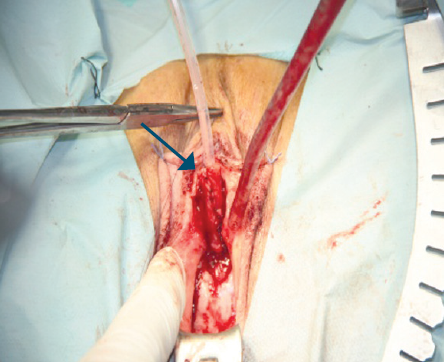 Рис. 4. Края буккального лоскута сопоставлены (стрелка) и формируют неоуретру