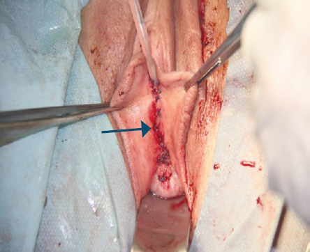 Fig. 5. Wholeness of vulvar epithelium (arrow) over the neourethra is restored