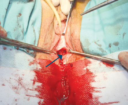 Учитывая выявленное осложнение и жалобы пациентки, принято решение о дополнительном иссечении доступных фрагментов петли. Объем корригирующей операции на уретре планировалось уточнить во время хирургического вмешательства, о чем больная была предупреждена. 18.03.2013 при резекции сетки, пенетрирующей в стенку мочеиспускательного канала, определены рубцово-дистрофические изменения тканей, окружающих шейку мочевого пузыря и некроз задней стенки уретры. Нежизнеспособные ткани, включая уретру, были удалены до уровня шейки мочевого пузыря. В последнем оставлен катетер Foley Ch12. C целью увеличения объема васкуляризированных тканей в везико-вагинальное пространство перемещен бульбокавернозный лоскут Мартиуса (рис. 1). Рана передней стенки влагалища закрыта отдельными швами хирургической нитью Викрил 2/0. Операция завершена наложением эпицистостомы.