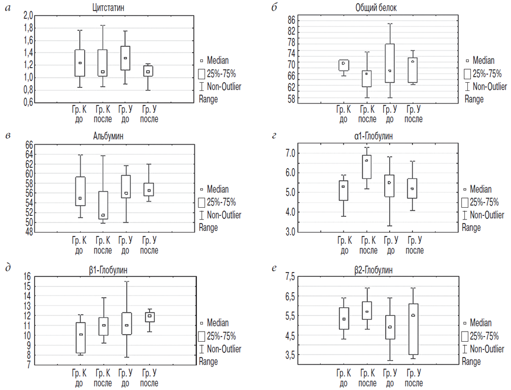 Рис. 1. Распределение цистатина С (а) и показателей электрофореграммы (б–е) у пациентов основной (гр. У) и контрольной (гр. К) групп до и после операции