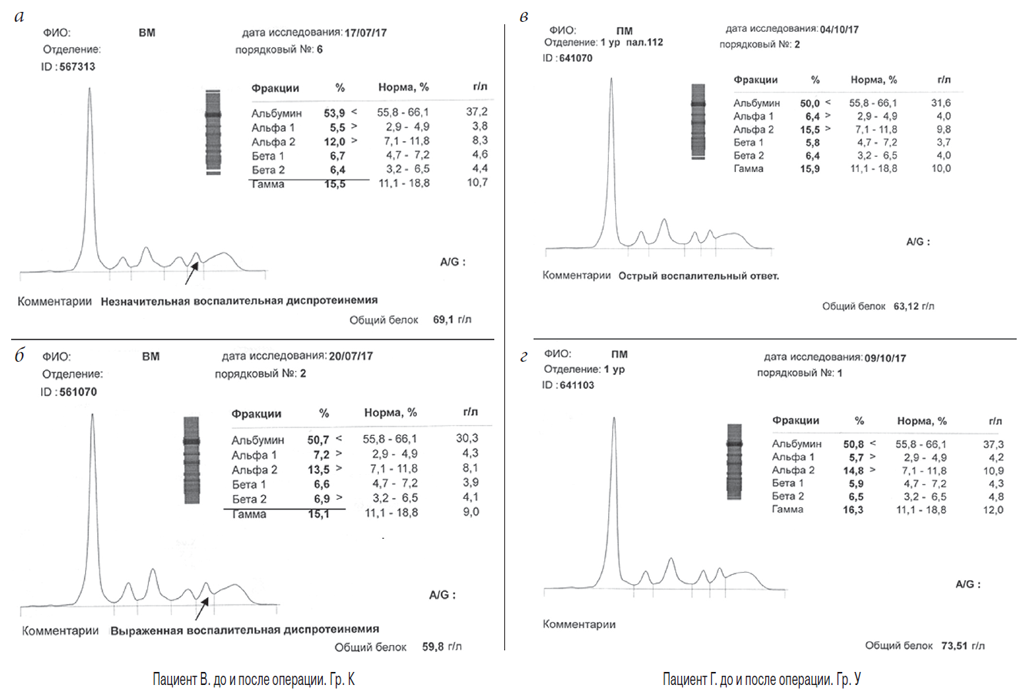 Изменение уровня белков сыворотки крови связано с патологическими состояниями организма, в частности с острым воспалительным ответом [18]. Белки острой фазы — это плазменные протеины, образующиеся преимущественно в печени, оказывающие как прямое, так и опосредованное бактерицидное и/или бактериостатическое действие, служащие хемоаттрактантами, неспецифическими опсонинами и ингибиторами альтерации. В результате исследования белковых фракций плазмы крови удалось выявить изменение качественного и количественного состава отдельных белков и их фракций плазмы крови при нормальном уровне общего белка в до- и послеоперационном периоде.