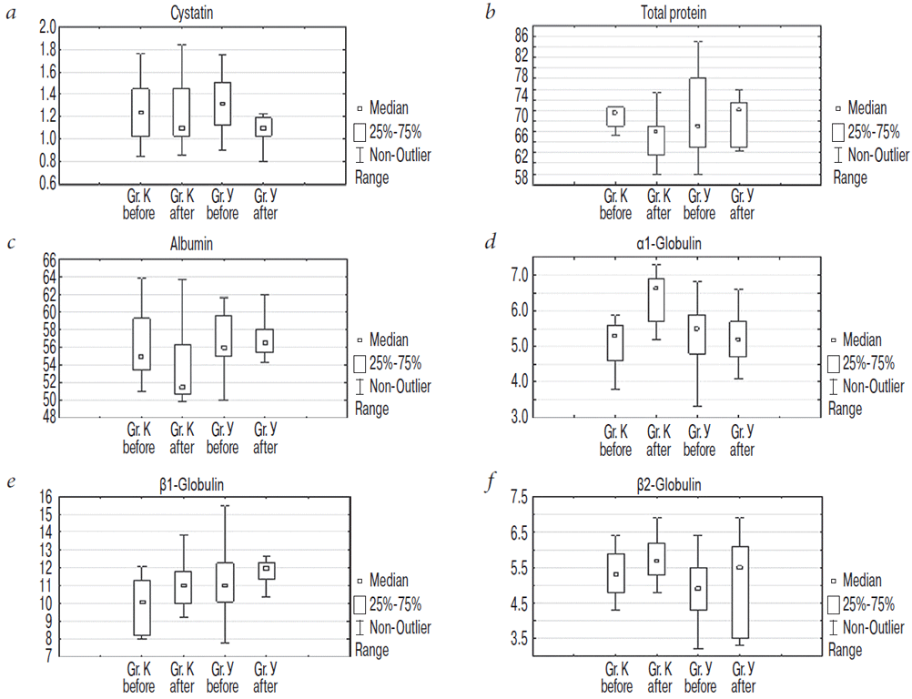Анализ крови на цистатин С выполняли на биохимическом анализаторе Huma Star 600 иммунотурбодиметрическим методом. Электрофорез белков сыворотки крови выполняли с использованием системы капиллярного электрофореза Capillaris — 2Flex Piercing компании Sebia. Этот метод позволяет разделять белки на шесть фракций в соответствии с их физическими свойствами (альбумины и пять фракций глобулинов). В каждую фракцию мигрируют белки с определенной биологической функцией, определенным клинико-диагностическим значением. Электрофорез белков сыворотки крови — один из лучших инструментов скрининга, обеспечивающего более эффективный подход к идентификации патофизиологических состояний, поскольку функции белков чрезвычайно разнообразны и изменение их концентраций в биологических жидкостях отражает даже незначительные функциональные нарушения систем организма [13].