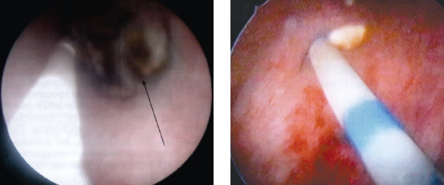 With localization of calculi in the renal pelvis and calyx, in 2016–2018, PNLT or nephrolitholapaxy was most commonly performed in 658 surgeries for any size and density of kidney stones. In the case of percutaneous nephrolitholapaxy, percutaneous puncture of the pelvicalyceal system was performed, as well as its bougieurage, casing installation, and further crushing and washing away of the stone fragments using an ultrasonic lithotripter under the nephroscope control (Fig. 2). For ultrasound lithotripsy, we used the Karl Storz apparatus (Germany) and 3–3.5 mm diameter probe. With ultrasound lithotripsy, there is a simultaneous fragmentation of the stone and the elimination of fragments via the inner lumen of the probe. With a high density of the stone, large fragments can also be formed during crushing and were removed with forceps. For nephrolithotripsy, a Karl Storz pneumatic lithotripter, Dornier laser lithotripter, and Luminis high-frequency laser were used. We also used a standard nephroscope with a sheath of 26 and 28 Ch and a mini-percutaneous nephroscope with a sheath of 16.5 Ch (both manufactured by Karl Storz). High clinical efficiency of percutaneous methods in the treatment of patients with urolithiasis was noted, which reached 95%. Since 2000, endoscopic methods of stone disintegration (CULT and PNLT) have been used to destroy calculi of any localization and reduce bed-days by two to three times. Over the past 3 years, the number of laparoscopic surgeries for urolithiasis has declined dramatically in our clinic, resulting in endovideosurgical ureterolithotomy performed in only 33 patients. Relapses of lithogenesis after PNLT have been reported, particularly in patients with large bilateral kidney stones, but the risk of recurrence was reduced to 10% when performing specific metaphylaxis based on the analysis of the urinary calculus composition followed by drug treatment, adherence to diet, and lifestyle adjustments.