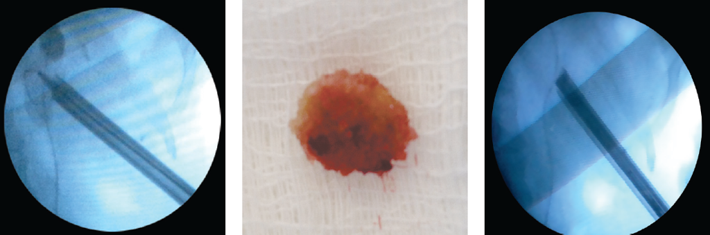 Рис. 2. Этапы перкутанной нефролитолапаксии: слева — введение направителя, нефроскопа с кожухом, струны под рентгеновским наведением; в центре — удаленный конкремент правой почки; справа — конкремент отсутствует, виден нефроскоп с кожухом