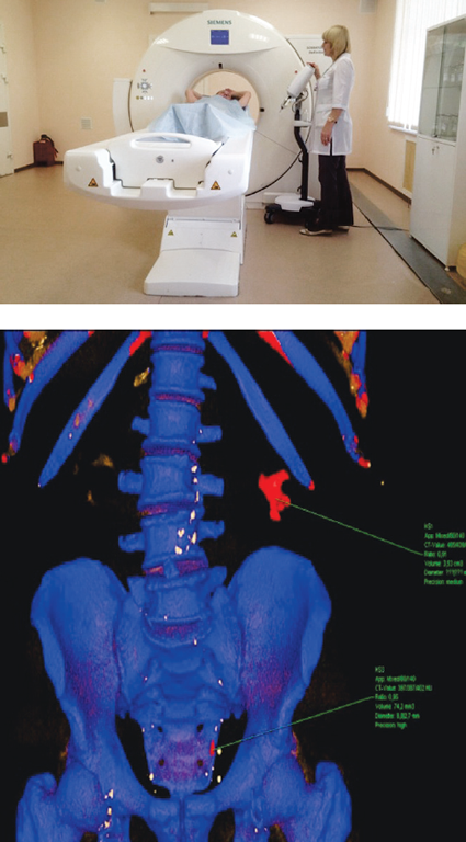Рис. 4. Двухэнергетическая мультиспиральная компьютерная томография пациента с уратным уролитиазом. Коралловидный камень левой почки и камень тазового отдела левого мочеточника
