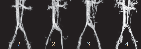Fig. 2. Stages of the ileal venous compression syndrome (May–Thurner Syndrome) according to MRI of the vena cava inferior and pelvic blood vessels with 3D reconstruction according to A.A. Kapto (2018): stage 1 – compression of the left common iliac vein; stage 2 – compression of the left common iliac vein with its dilatation; stage 3 – compression of the left iliac vein with the closure of the vessel walls in its central part and with its dilatation; stage 4 – pronounced and extended narrowing of the left common iliac vein lumen