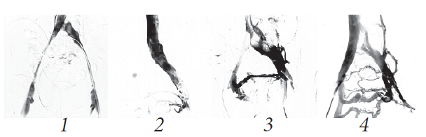 Fig. 3. Stages of May–Thurner syndrome according to ileocavagraphy depending on the presence and intensity of collateral circulation according to A.A. Kapto (2018): 1 – lack of contrast in the pelvic veins; 2 – contrasting of the pelvic veins; 3 – contrasting of the pelvic veins with the flow of contrast into the contralateral right common iliac vein; 4 – contrasting of the pelvic veins with the flow of contrast into the right common iliac vein and ascending lumbar veins on the left