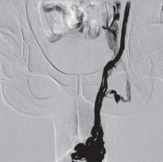 Рис. 5. Ретроградная флеботестикулография пациента с Nutcracker syndrome и синдромом Мея – Тюрнера. Контрастирование левой общей подвздошной вены через кремастерную вену