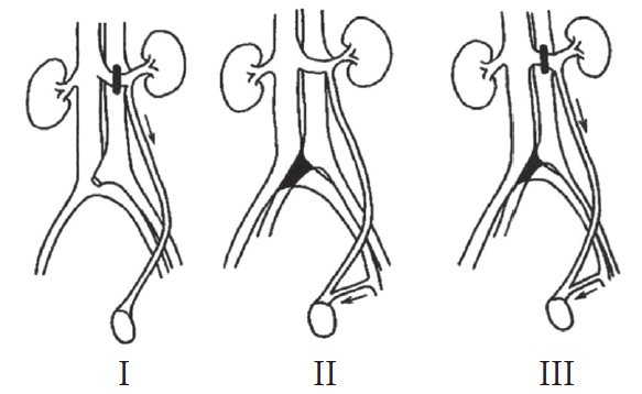 Fig. 6. Classification of varicocele according to B.L. Coolsaet (1980): I – renospermic type; II – ileospermic type; III – mixed type
