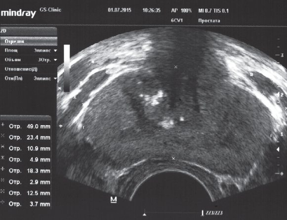 Fig. 7. Transrectal ultrasound imaging of the prostate of patient K., 33 years old, with bilateral stage 3 varicocele and May–Thurner syndrome. Prostate volume – 22.3 cm3 . The maximum diameter of the veins on the left is 10.9 and 18.3 mm, on the right – 12.5 mm. Chronic calculous prostatitis