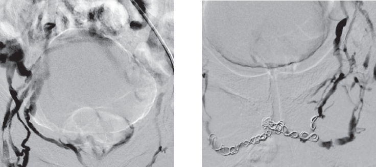 Рис. 8. Ретроградная рентгенохирургическая эмболизация простатического сплетения доступом через v. basilica (трансбазилярный доступ). Слева контрастируется простатическое венозное сплетение и кавернозные тела полового члена в месте патологического венозного дренажа, справа — отсутствие венозной утечки после эмболизации спиралями Gianturko (Cook Medical, USA)