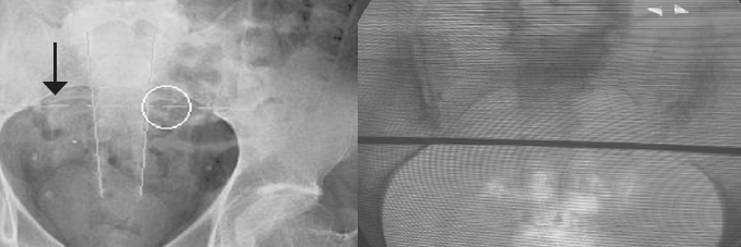 Рис. 1. Рентгенограмма костей таза в прямой проекции с указанием анатомических ориентиров и проведенных через них условных линий для определения отверстия S3, стрелкой указан край илиосакрального сочленения, кругом S3 обозначено отверстие (слева). Справа на снимке металлическим инструментом указаны проекции третьего сакрального отверстия