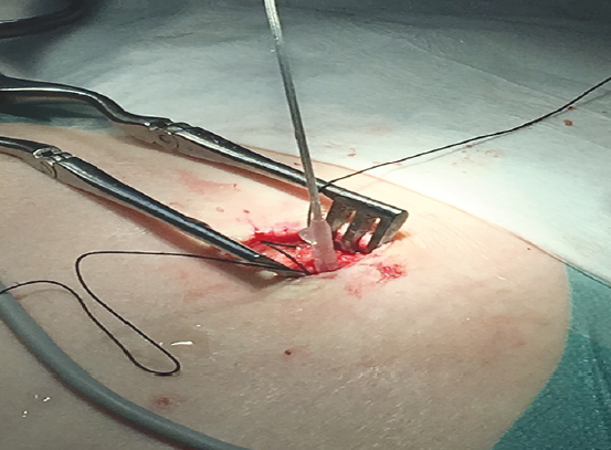 Fig. 4. Fixation of the electrode with nodular sutures to the fascia with a silicone “anchor” to prevent migration of the electrode