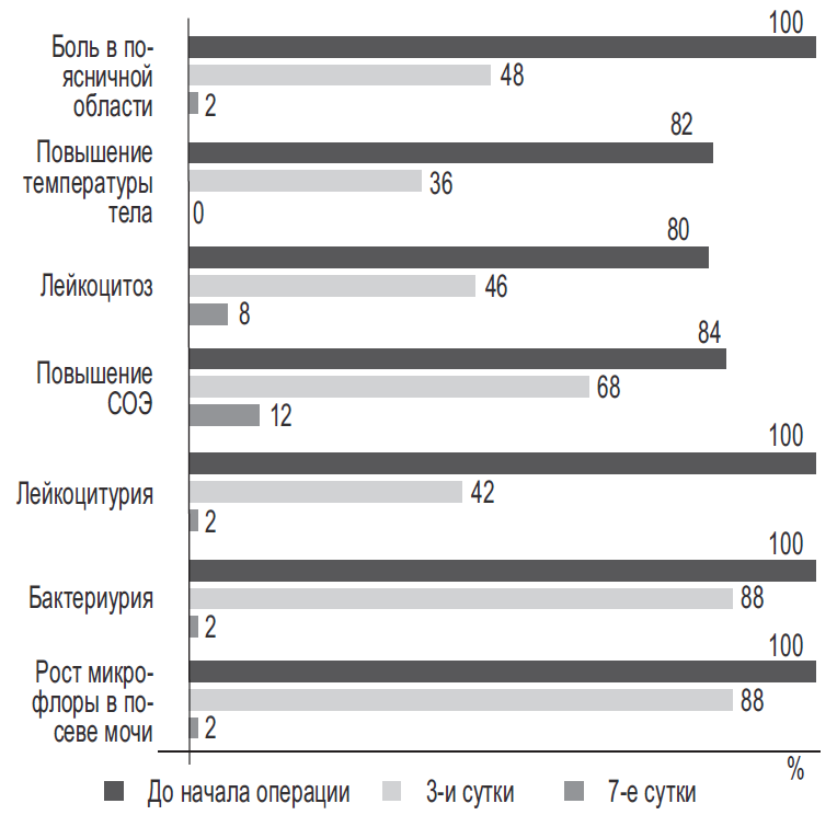 Эффективность лечения оценивалась как хорошая при быстром (на 2–3-е сутки) улучшении состояния пациента: купировании болей в поясничной области, нормализации температуры тела, положительной динамике лабораторных показателей. Клиническая эффективность лечения пациентов с неосложненным пиелонефритом представлена на рисунке.