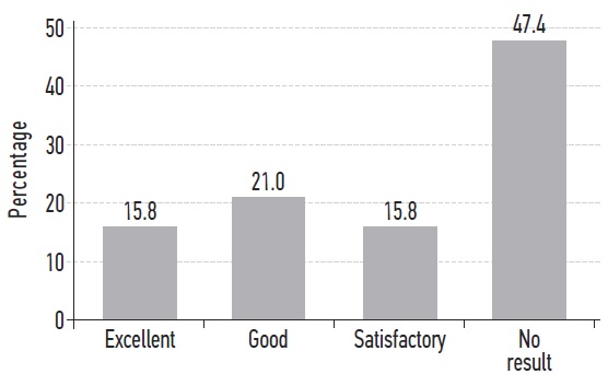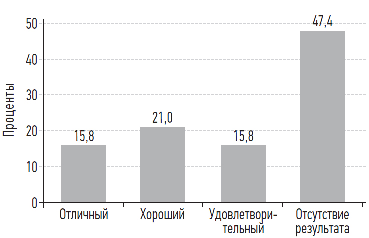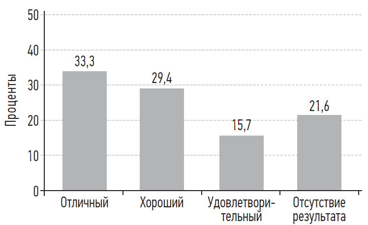 После окончания медикаментозной терапии 17 (33,3 %) пациентов субъективно оценили результат лечения как «отличный», 15 (29,4 %) — как «хороший», 8 (15,7 %) — как «удовлетворительный», 11 (21,6 %) пациентов указали на отсутствие положительного результата терапии (рис. 1). Таким образом, 32 (62,7 %) пациента оценили результат медикаментозной терапии как «отличный» и «хороший».