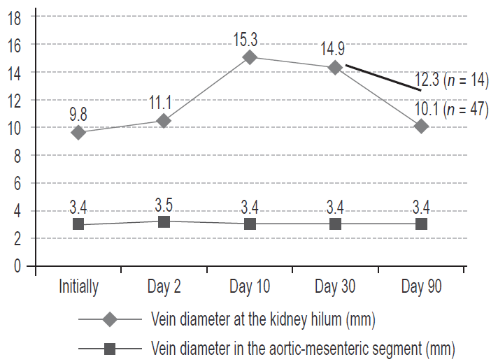The Ivanissevich surgery was performed in all patients, except for 3 patients with clinically significant compression of the left renal vein. On the next day of the surgery, all 61 operated patients showed an increase in the diameter of the left renal vein by 1.5–2 mm (average: 11.1 ± 0.1 mm) (Fig. 1). The linear blood flow velocity in the renal hilum area decreased by 5–6 cm/s in all cases and became equal to 17.1 ± 0.7 cm/s (Fig. 2). On the day 10 of the surgery, the left renal vein diameter in the hilum area increased by another 3–4 mm, while the linear blood flow velocity decreased by 2–2.5 cm/s (Figs. 1, 2).