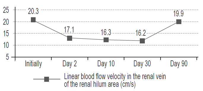Results. On the first day after ligation of the internal spermatic vein an increase in the concentration of biological markers of acute kidney damage in the blood and urine was noted. After surgery all patients showed an increase in the diameter of the left renal vein by 1.5–2 mm and a decrease in the linear blood flow velocity in the region of the renal vien by 5–6 cm/s. On the 10th day after the operation the diameter of the left renal vein was increasesd by 3–4 mm more and the linear blood flow velocity slows down by 2–2.5 cm/s. The restoration of blood flow velocity and the diameter of the left renal vein occurred within three months and in most cases returned to baseline and in 22.9% of patients recovery did not occur by the 90th day of observation.