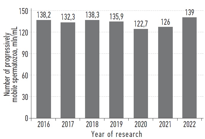 Proportion of progressively mobile spermatozoa (A + B). In contrast to the concentration and number of spermatozoa in the ejaculate, an opposite trend was observed for the proportion of progressively motile spermatozoa. The average values of this indicator increased in each subsequent year of observation (on average by 1.3% annually), i. e. from 47% in 2016 to 55% in 2022 with a ‘plateau’ period of 53% in 2019 and 2020 (Figure 3).