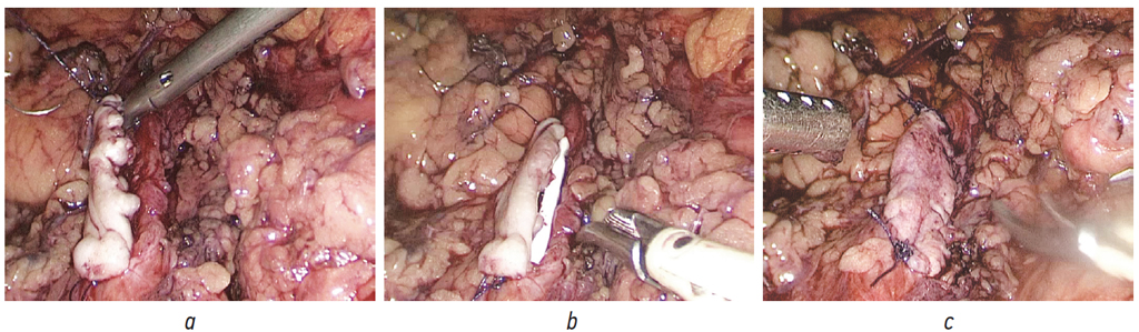 Рис. 1. Пластика стриктуры мочеточника буккальным лоскутом: a — лоскут пришит к латеральному краю рассеченного суженного участка мочеточника; b — антеградно установлен мочеточниковый стент; с — дефект мочеточника полностью замещен лоскутом из слизистой оболочки щеки / Fig. 1. Plastic surgery of ureteral stricture with a buccal flap: a — the flap is sutured to the lateral edge of the dissected narrowed portion of the ureter; b — an antegrade ureteral stent was placed; с — the defect of the ureter was completely replaced by a flap from the buccal mucosa