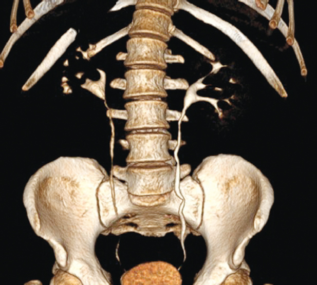 Рис. 2. Комьютерная томография-урография пациента через 36 мес. после буккальной пластики верхней трети правого мочеточника. Хорошая проходимость верхних мочевыводящих путей / Fig. 2. CT urography of the patient 36 months after buccal plasty of the upper third of the right ureter. Good patency of the upper urinary tract