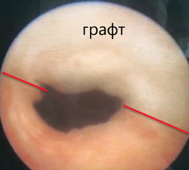 Рис. 3. Эндоскопическая картина при уретероскопии у пациента после пластики мочеточника лоскутом из слизистой оболочки щеки / Fig. 3. Endoscopic picture during ureteroscopy in a patient after ureteroplasty with a flap from the buccal mucosa