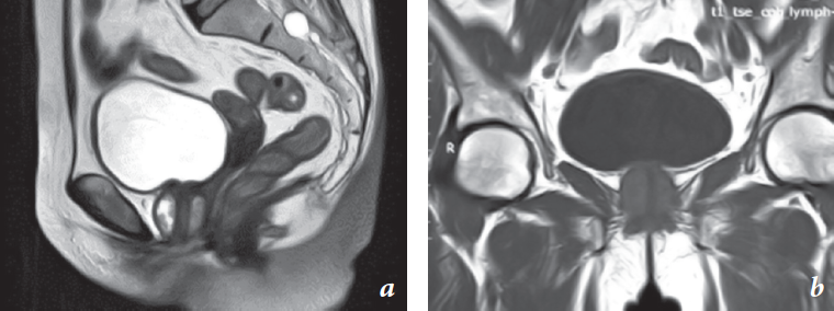 Рис. 1. Магнитно-резонансная томография органов малого таза пациентки В., 56 лет: a — фронтальная проекция, b — сагиттальная проекция. Опухоль с четкими очертаниями расположена вокруг уретры