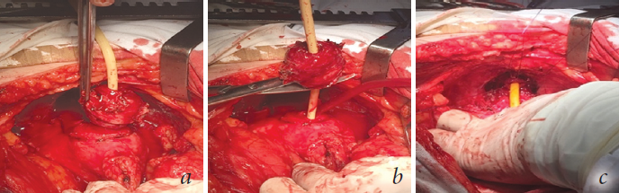 Fig. 2. The progress of the operation. Isolation of a tumor located around the urethra (a), excision of the tumor (b) with preservation of the neck the bladder and the distal part of the urethra (c)